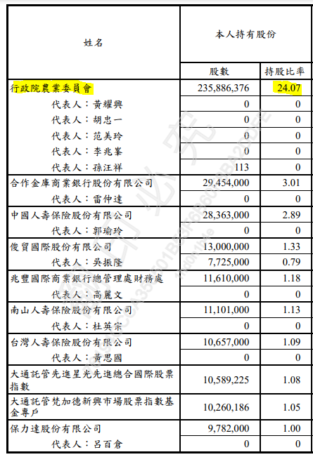 不過目前最大股東仍是行政院農委會,