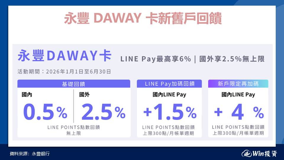 如果你是 LINE Pay 的重度使用者,2026 上半年新戶申辦 DAWAY 卡有 6%回饋,相當值得。