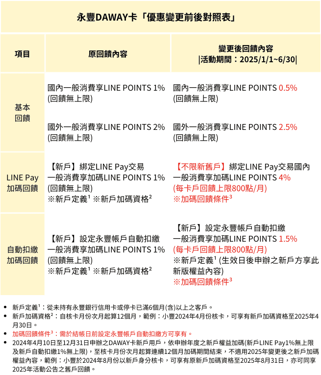 那從 2025 年 7 月起,DAWAY 卡的 LINE Pay 加碼回饋方案就會調整,只剩下: