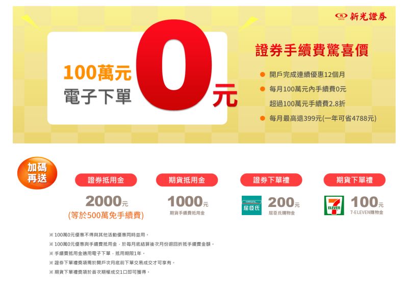 新光證券提供新開戶的投資人,在前 12 個月,每月電子下單 100 萬以內,就可享有手續費 0 元的優惠,