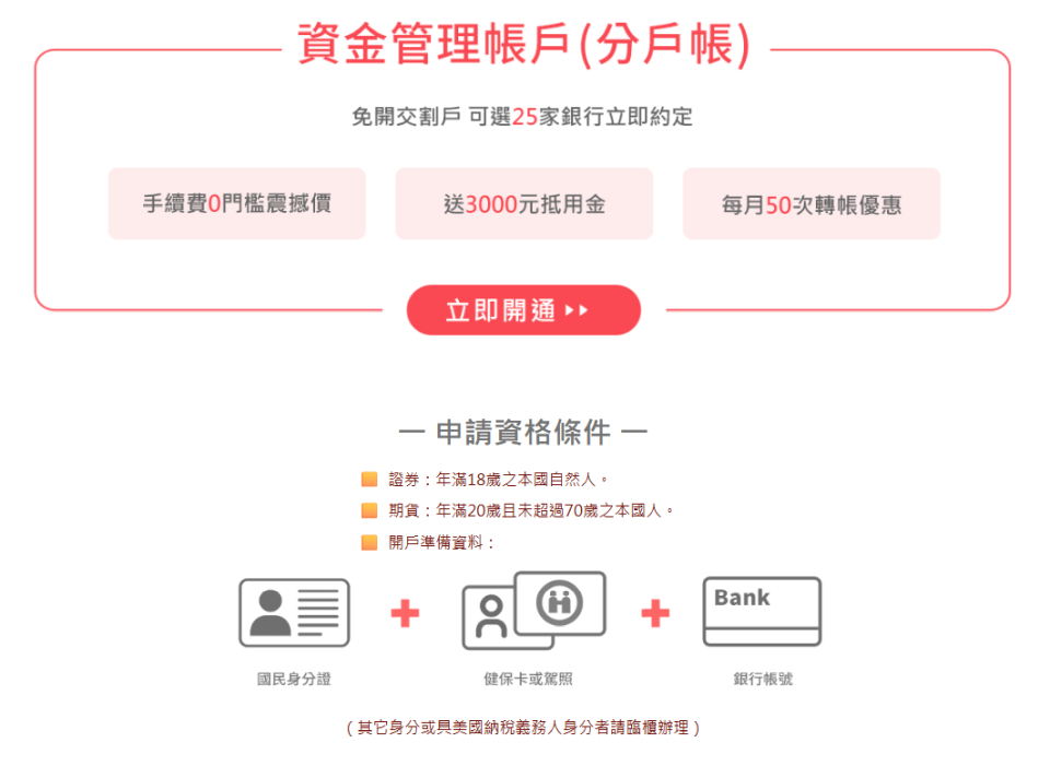 | 交割銀行 | 免開交割戶,可選 25 家銀行立即約定出入金。 |