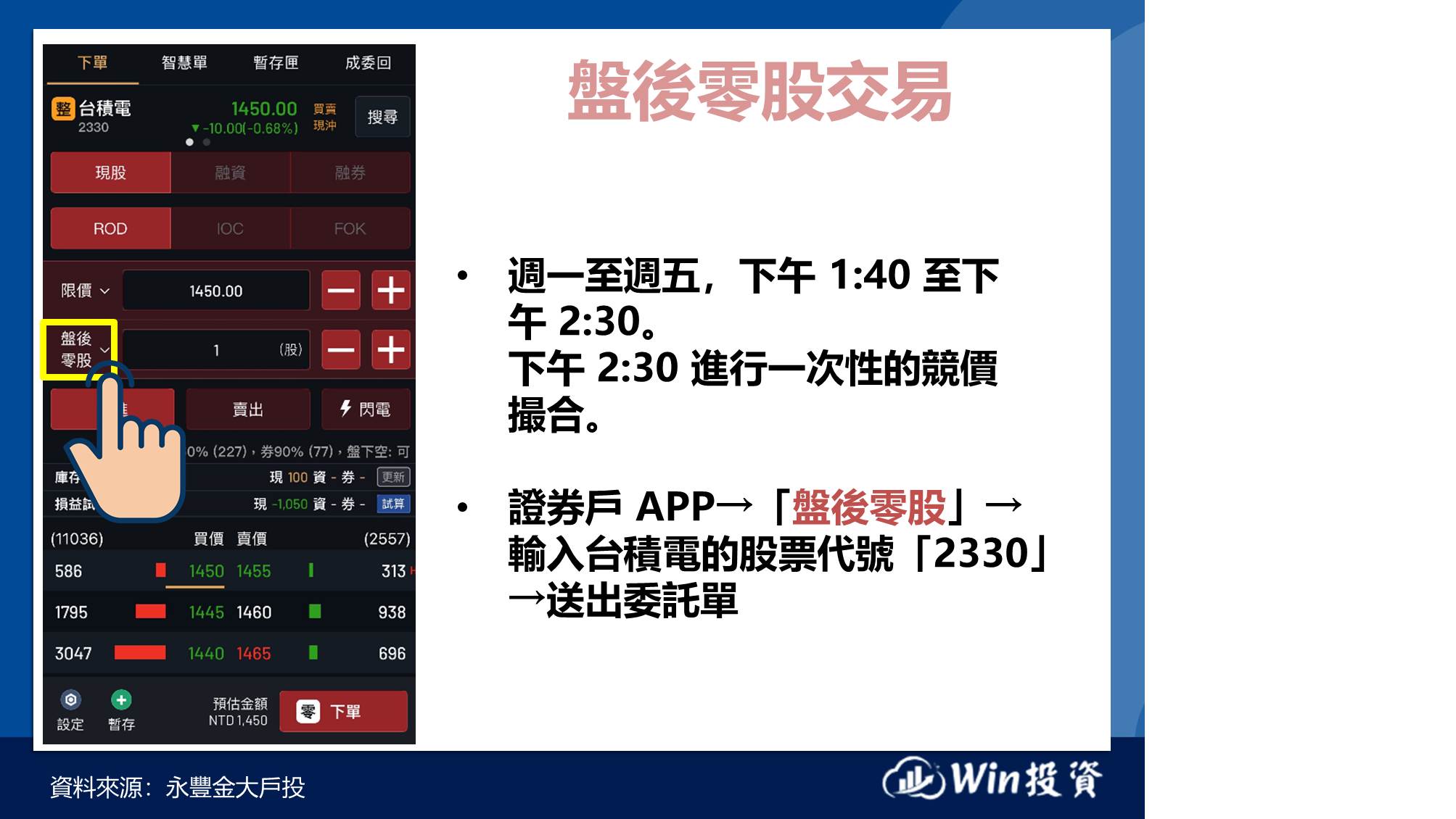 打開你的證券戶 APP 或電腦版交易軟體,進入「盤後零股」交易專區。