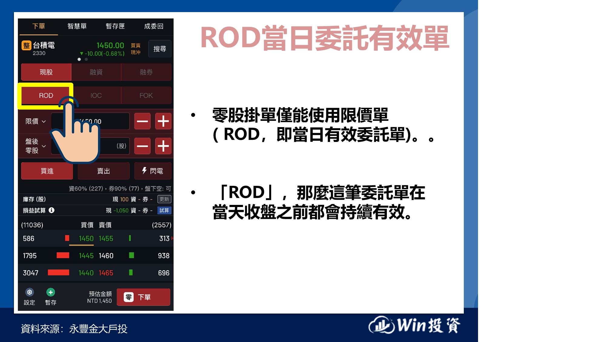 如果選擇「ROD」,那麼這筆委託單在當天收盤之前都會持續有效。
