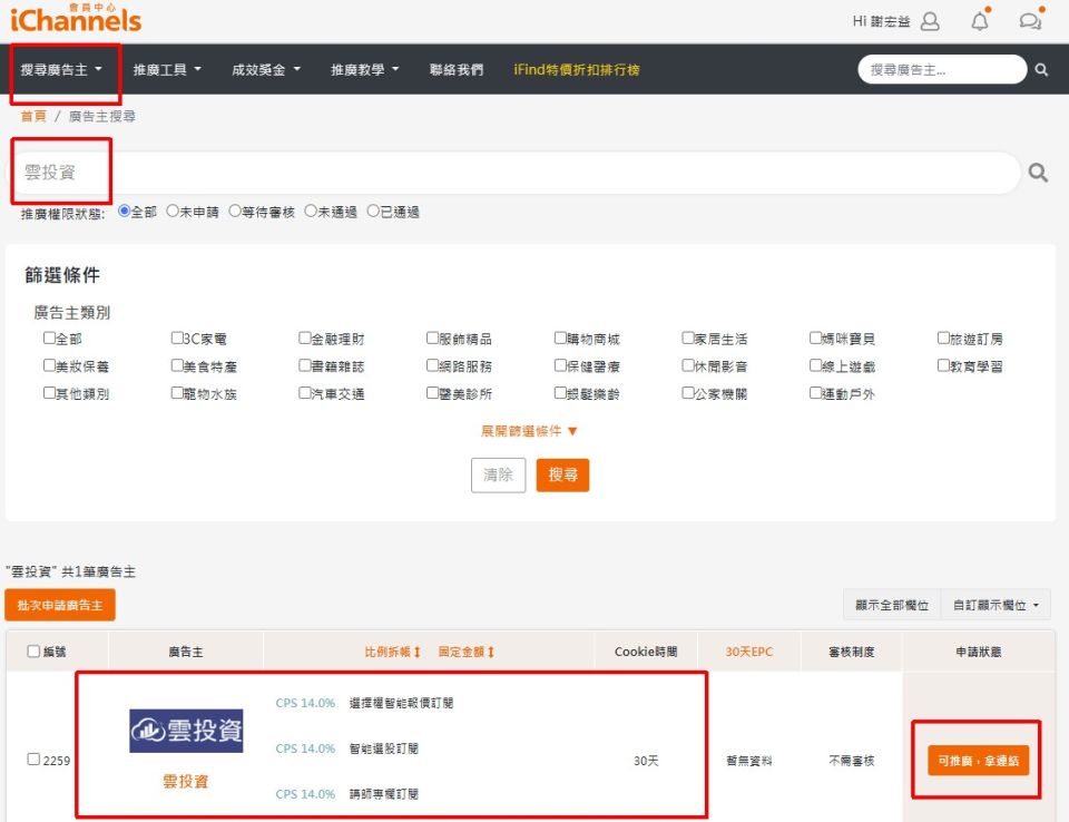 登入會員身份後,在主選單的廣告主連結,輸入「Win 投資」即可找到我們的推廣品牌。