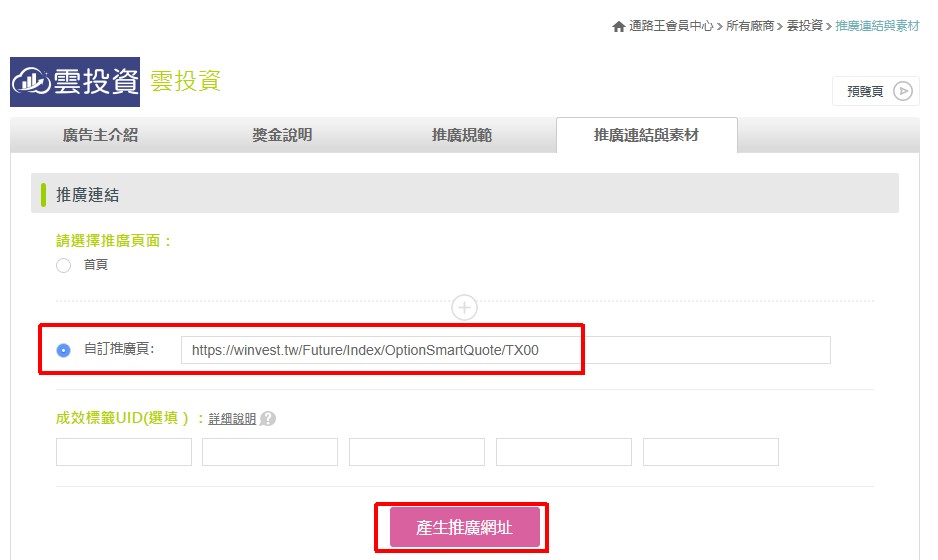 而我就以推廣選擇權智能報價訂閱做範例,在「自訂推廣頁」輸入:https://winvest.tw/Future/Index/OptionSmartQuote/TX00,然後按「產生推廣網址」。