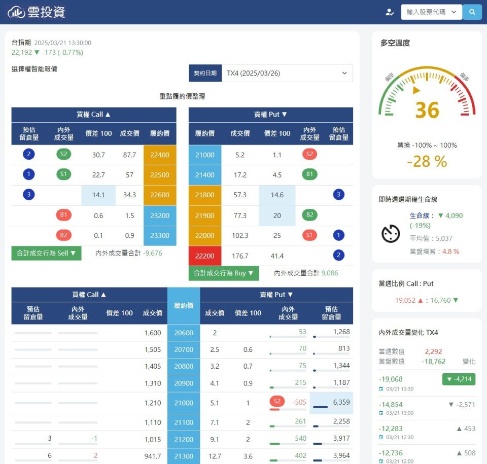 選擇權智能報價從台指選擇權籌碼中,分析出市場的多空趨勢,重點履約價整理,還會在市場變化大時發送 Line 推播至用戶的手機上,最好用的指標是多空溫度,可以顯示 0 到 100 的多空力道數據,即時反應台指交易市場變化,提供投資人最好的投資決策工具。