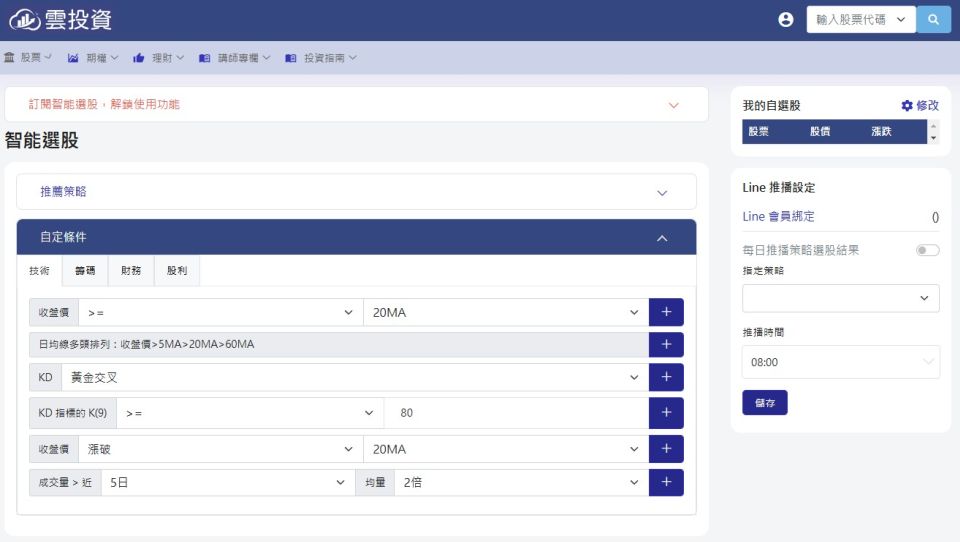 智能選股是提供使用者自定多項選股條件,系統可以同時篩選出符合條件之個股及 ETF 清單。