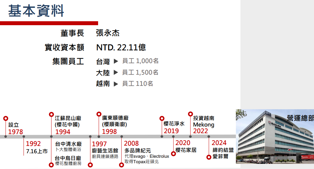 公司專注於居家生活產品,包括廚衛電器(抽油煙機、瓦斯爐、熱水器)及系統廚具,