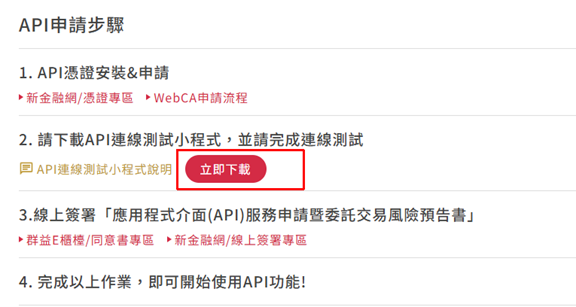 群益在新版本開始要求使用 Api 的使用者要先完成 Api 連線測試小程式,在群益 Api 下載的頁面下方會看到小程式的下載連結。