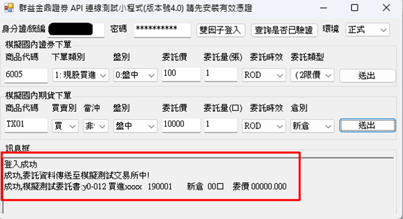 執行目錄內的 SKCOMVerifyDJ.exe 程式,輸入個人的群益登入帳密,然後在模擬國內證券下單和模擬國內期貨下單這邊,隨意輸入數值後按「送出」。