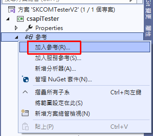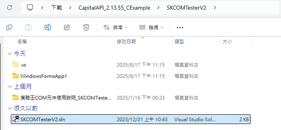 開啟範例目錄內的 \SKCOMTesterV2\SKCOMTesterV2.sln