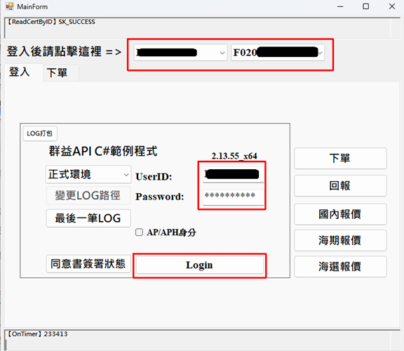 在範例程式上輸入群益帳密,執行「Login」,登入成功後,選擇上面的下拉,就可以看到自己的期貨帳號了。