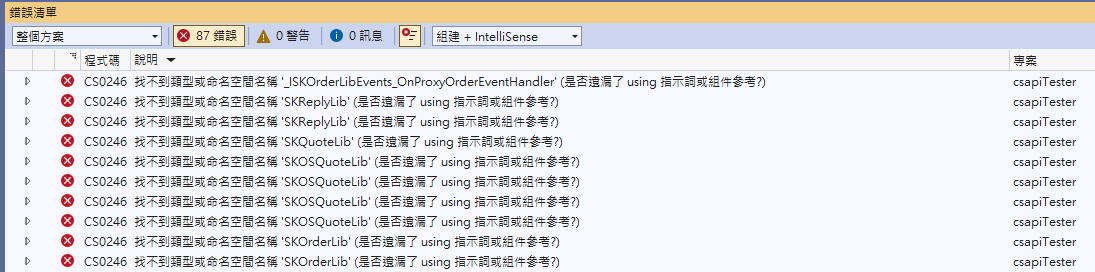 在編譯時,如果出現各種「找不到類型或命名空間名稱」的錯誤,如下圖: