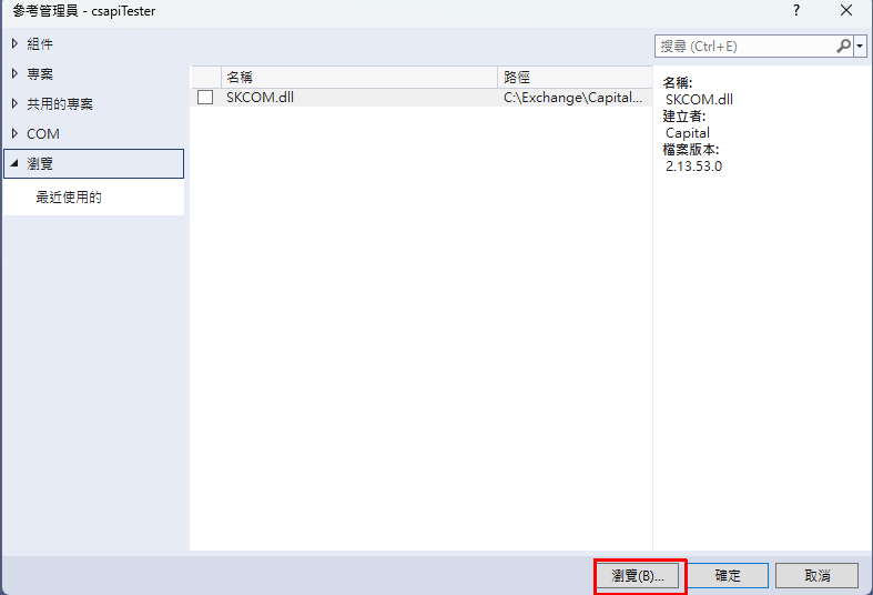 找到元件目錄下 > x64 > 的「SKCOM.dll」檔案,按加入。