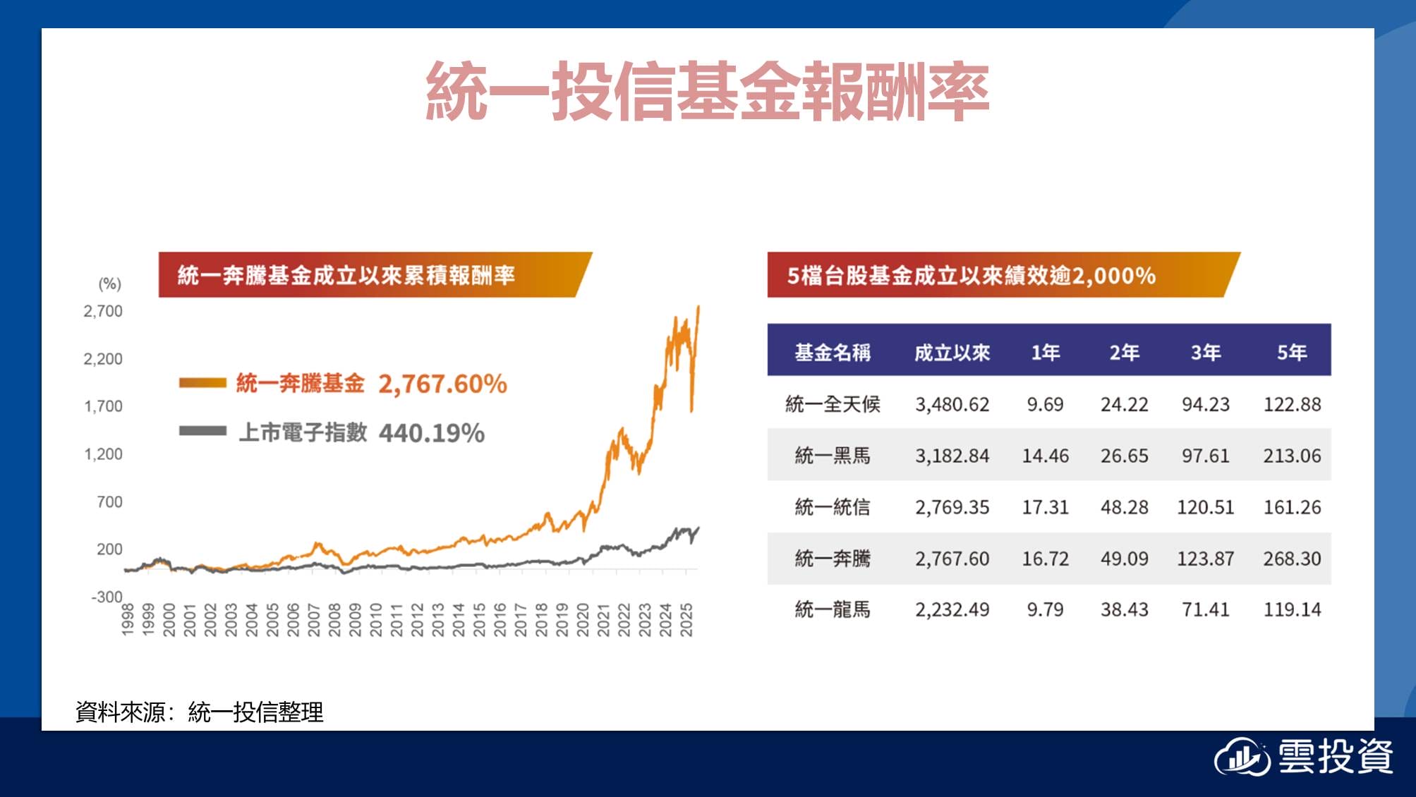 根據統一投信的資料,統一奔騰基金 這檔基金在過去五年報酬率高達 268.3%,年化報酬率約為 29.69%;