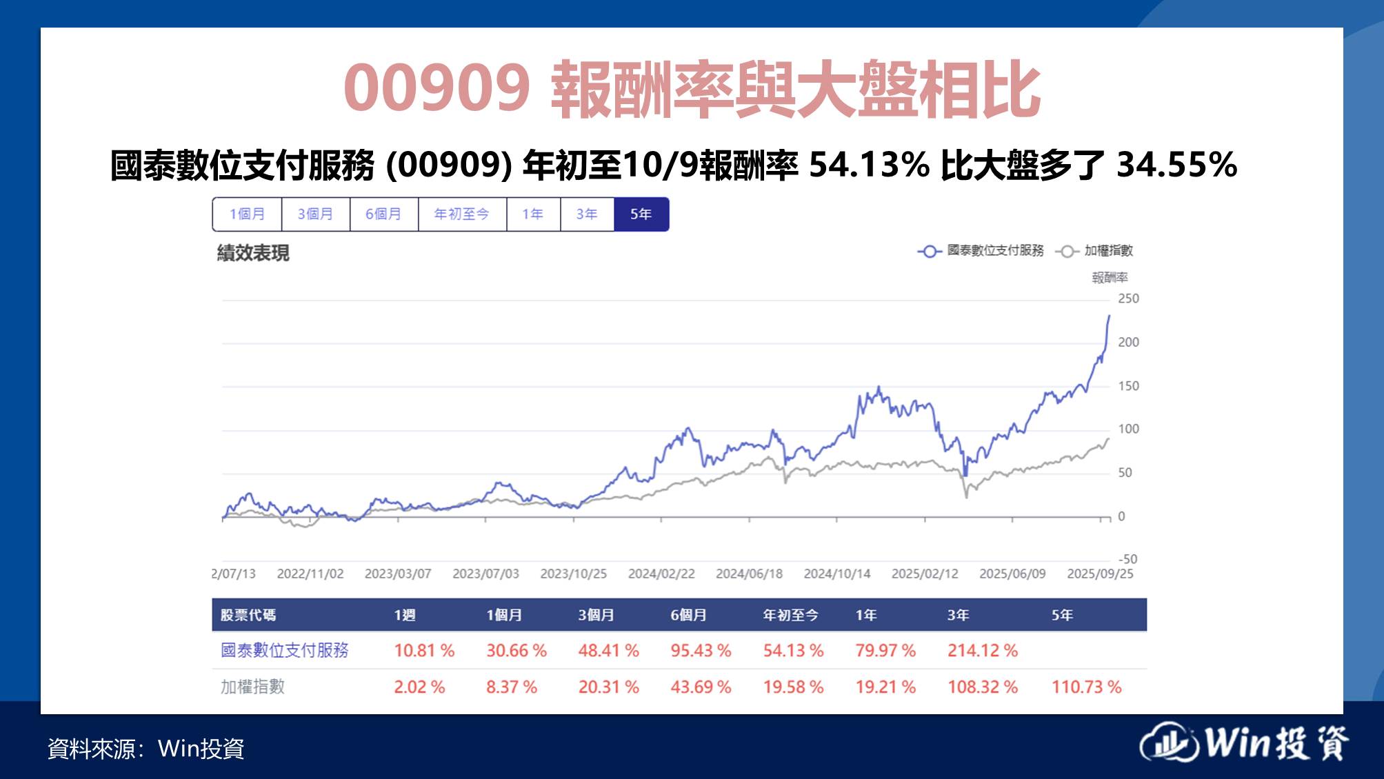 國泰數位支付服務 (00909) 2025年初至10/9報酬率 54.13% 比大盤多了 34.55%。