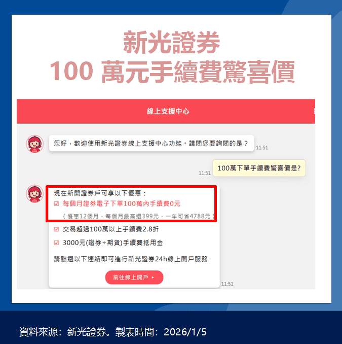 新光證券提供給電子下單客戶每月 100 萬元以內的手續費 0 元,並且能夠連續享有 12 個月。