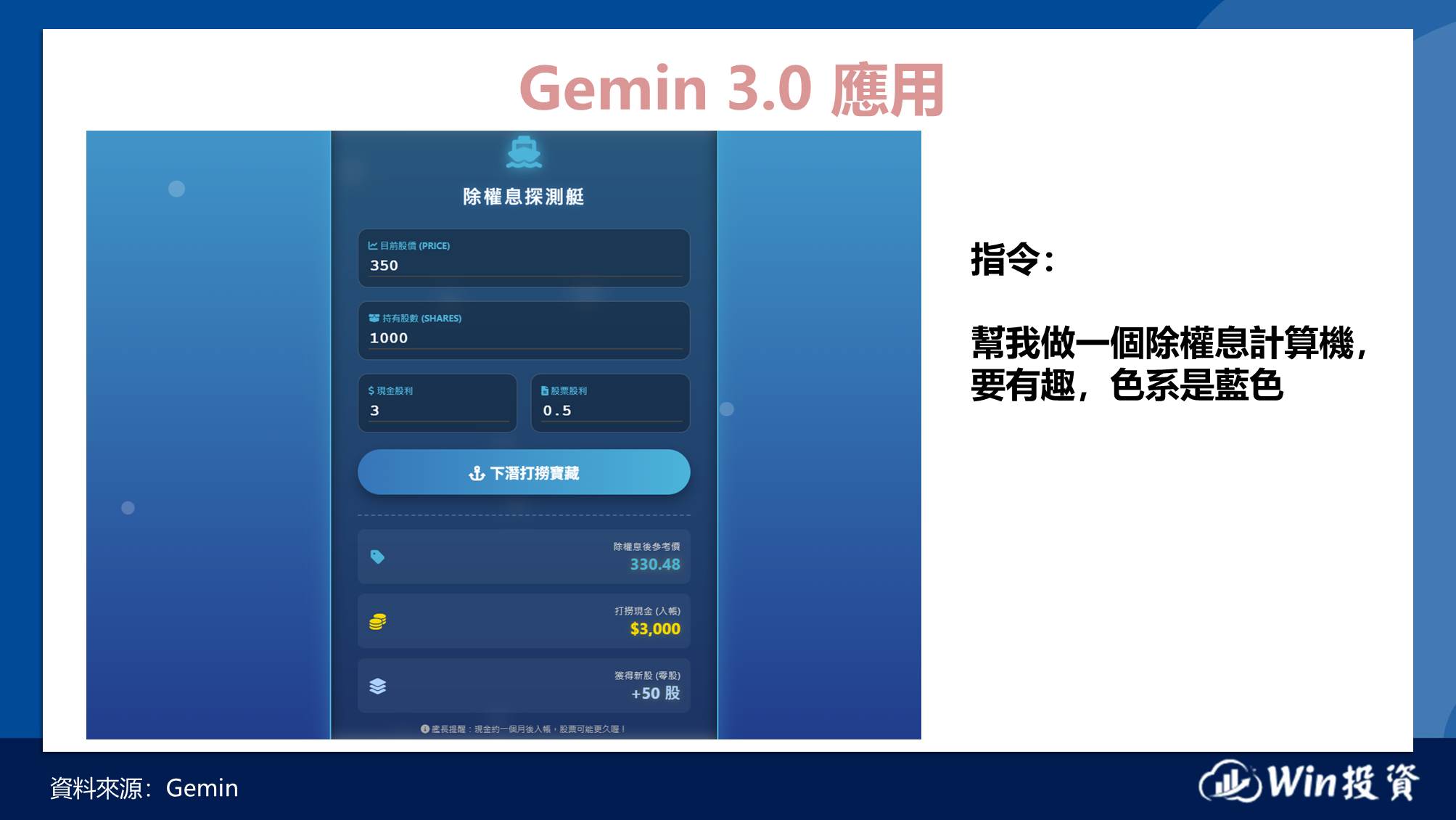 舉例指令:幫我做一個除權息計算機,要有趣,色系是藍色