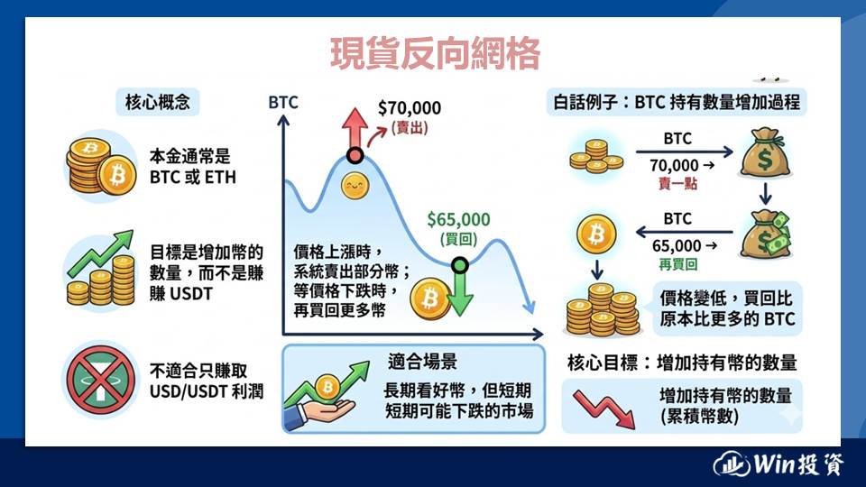 如果你是堅定的比特幣信仰者,目標是長期累積更多幣,那麼『現貨反向網格』在震盪下跌時能幫你低價接回更多代幣;