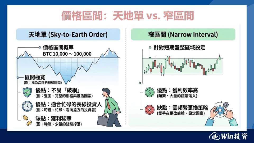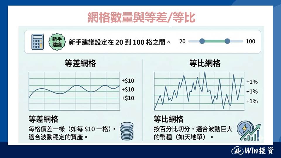 | 等差 vs. 等比 | 等差:每格價差固定; 等比:每格漲跌幅固定。 | 一般震盪區間建議用等差;大區間長線佈局建議用等比。 |