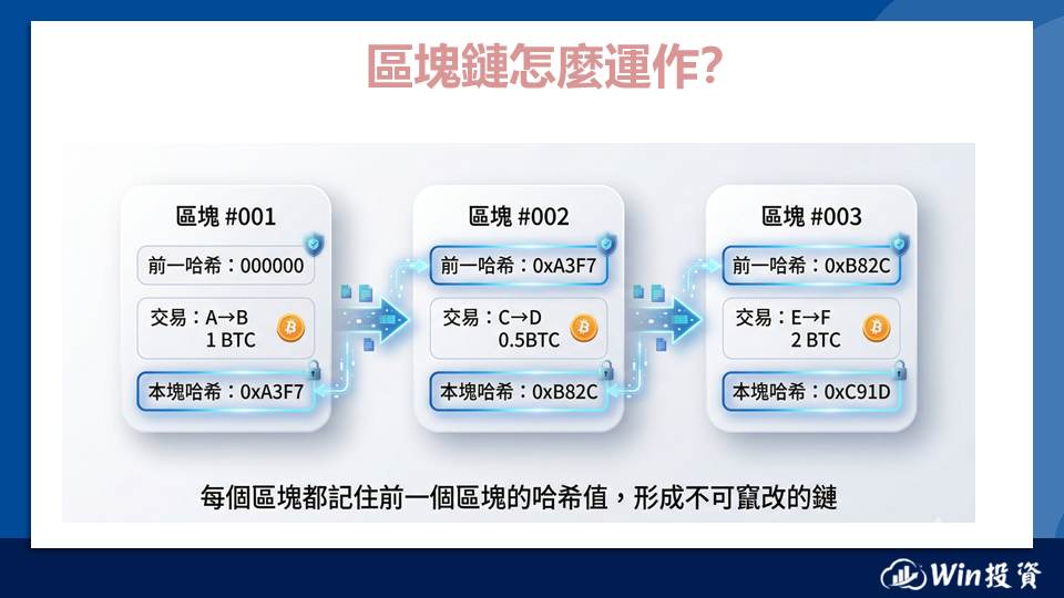 每一筆交易被打包成一個「區塊(Block)」,一個接一個串在一起,就是「區塊鏈(Blockchain)」。