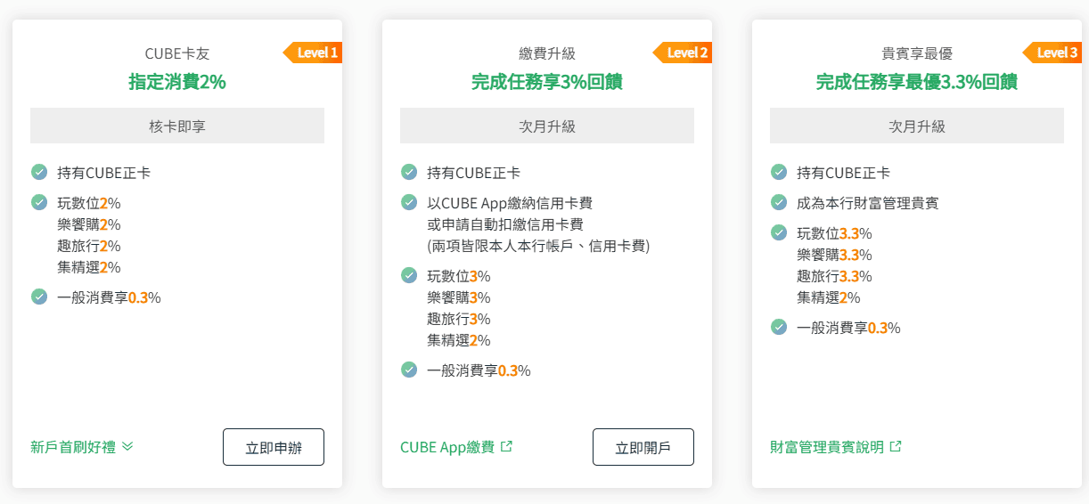 CUBE 卡權益分級共分為三級,分別為: