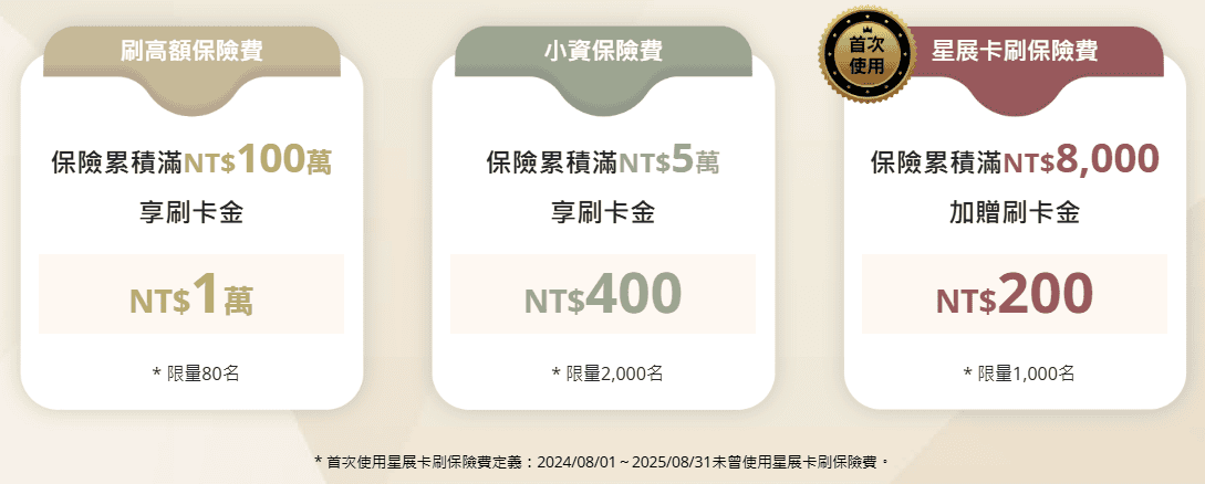 還可享:保險累積滿 NT$8,000,加贈刷卡金 NT$200(限量 1,000 名)