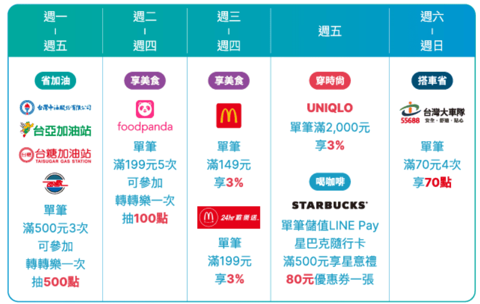 | 其他通路優惠 | 台灣大車隊悠遊卡扣款、加油、指定通路消費 | 2%~10% LINE POINTS | 50 點~10,000 元 | 台灣大車隊悠遊卡、加油站、指定通路 |