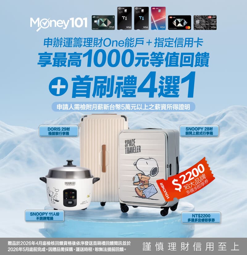 | 首刷禮 | (1)Snoopy 太空人 28 吋前開上掀式行李箱(藍、白不挑色) (2)史努比 11 人份不銹鋼電鍋(白色) (3)宜睿 NT$2,200 多選多即享券 (4)Doris 29 吋 極能裝行李箱(黑/白/灰/可可蛋奶四色隨機) 於 2026/1/1~2026/1/31 線上申請,,並於申請日期後 45 天內完成核卡 |